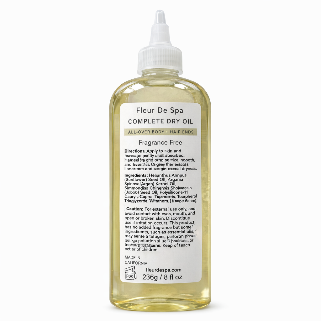 Experience effortless hydration with Fleur De Spa Complete Dry Oil, a lightweight, fast-absorbing oil designed for both skin and hair ends.